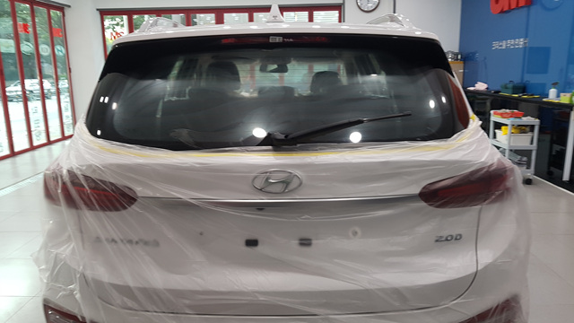 오늘 시공될 차량인 싼타페TM에 커버링을 하고 있습니다..